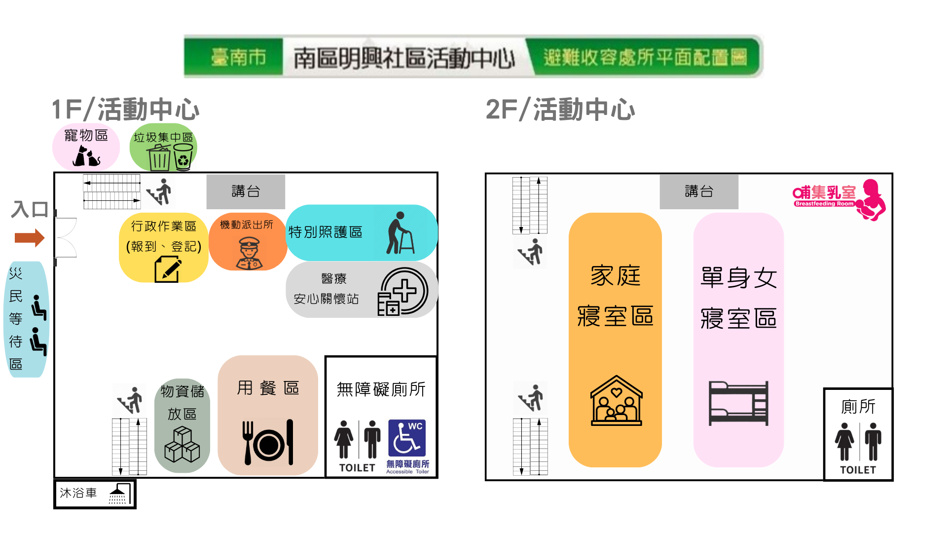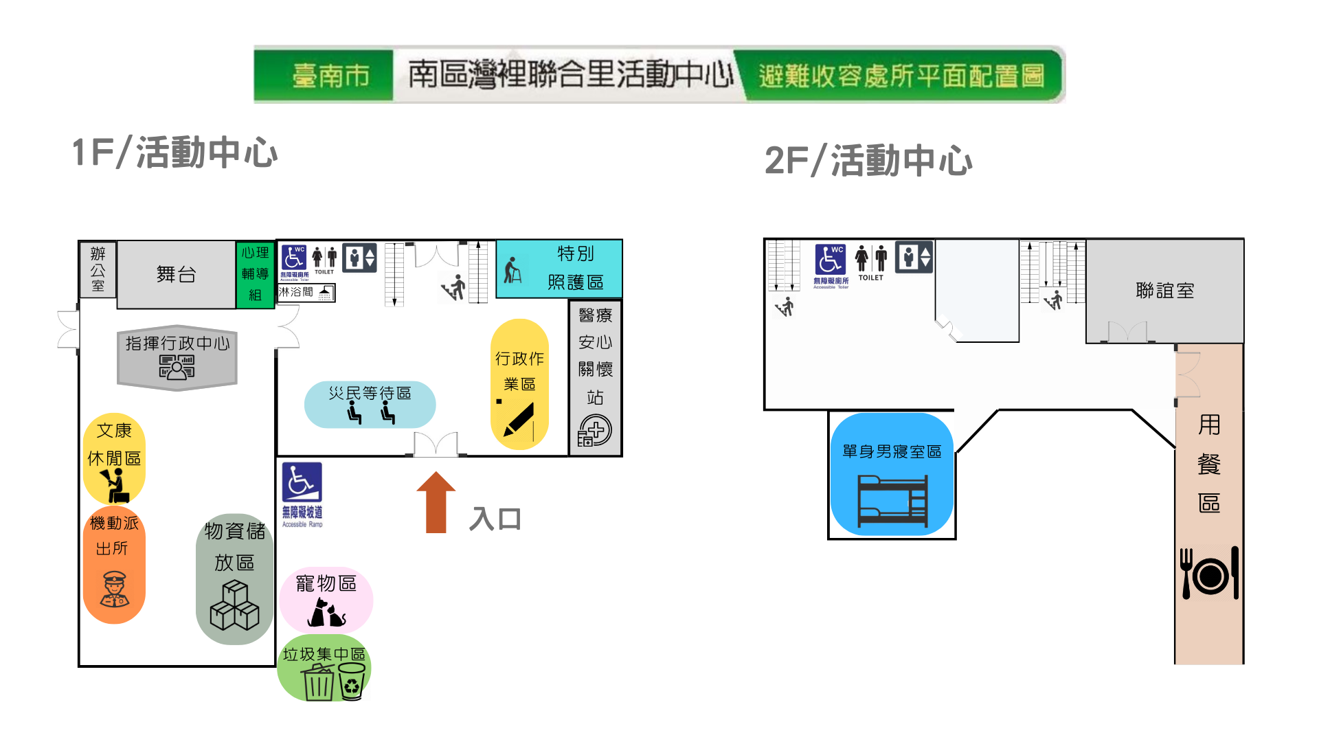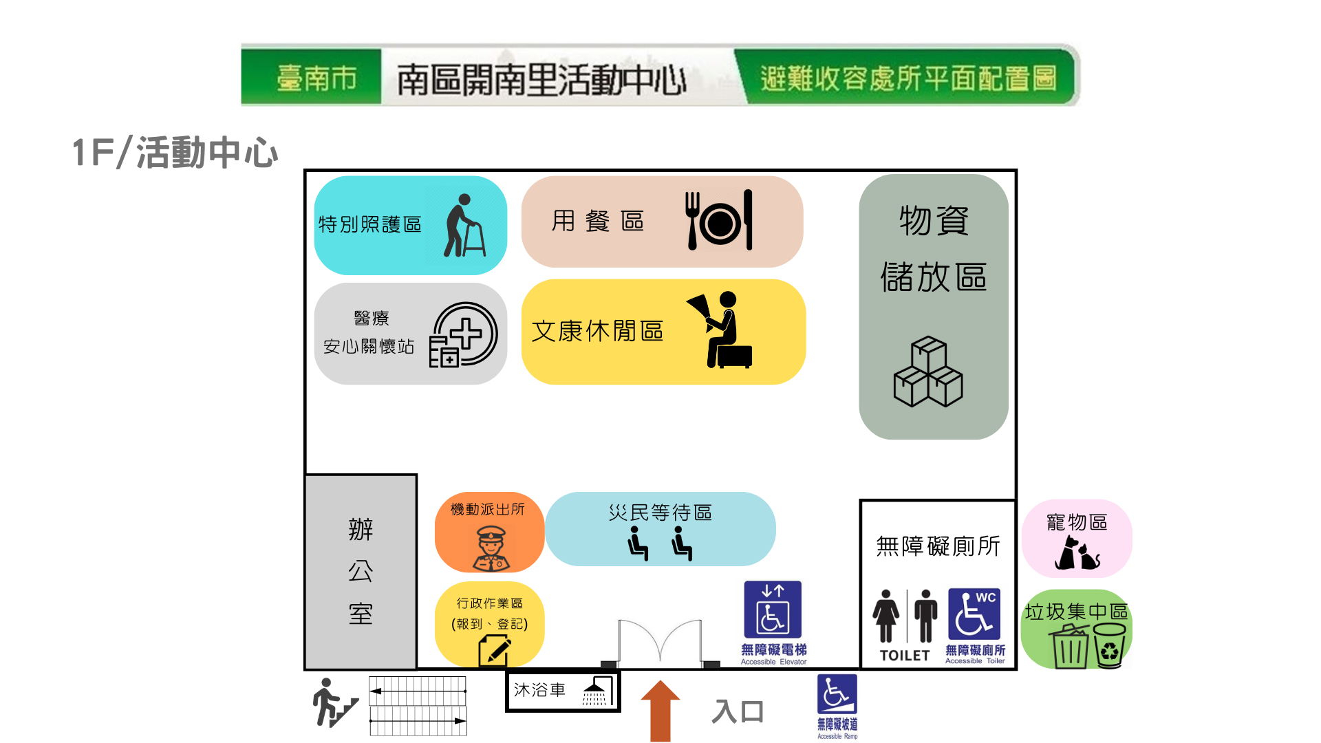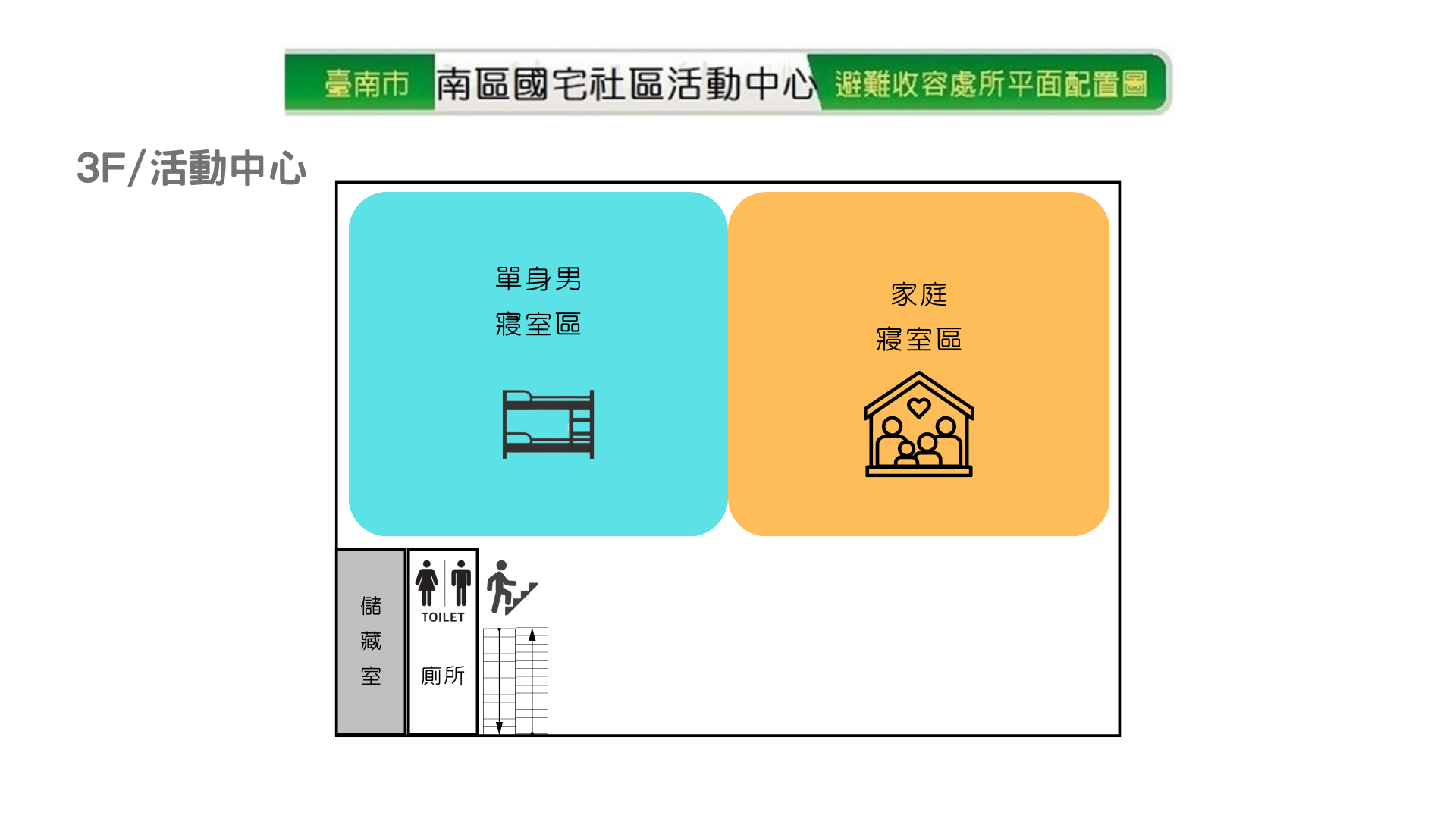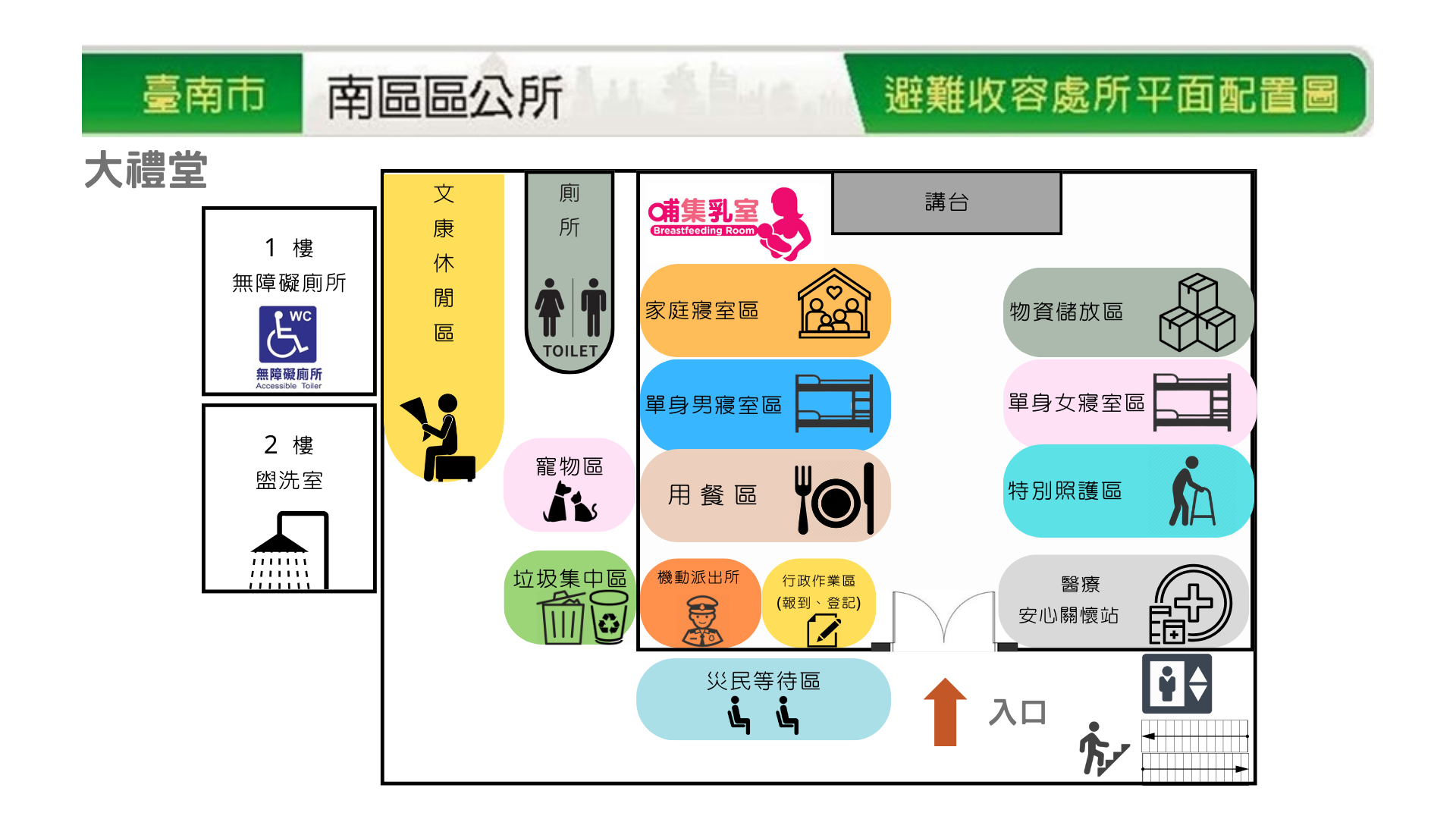 本區目前規劃12處避難收容處所南區區公所平面配置圖(3樓大禮堂)新興國中所平面配置圖(新興館)(操場)大成國中所平面配置圖(樂群館)(操場)臺南高商平面配置圖(中正大樓)(操場)龍崗國小平面配置圖(操場)永華國小平面配置圖(體育館1樓)(2樓)(操場)南寧高中平面配置圖灣裡聯合里活動中心平面配置圖(1樓與2樓)(3樓與4樓)明興社區活動中心1樓與2樓平面配置圖(1樓與2樓)(3樓)國宅社區活動中心平面配置圖(1樓)(2樓)(3樓)開南里活動中心平面配置圖(1樓)(2樓)鯤鯓里活動中心(1樓)(2樓)