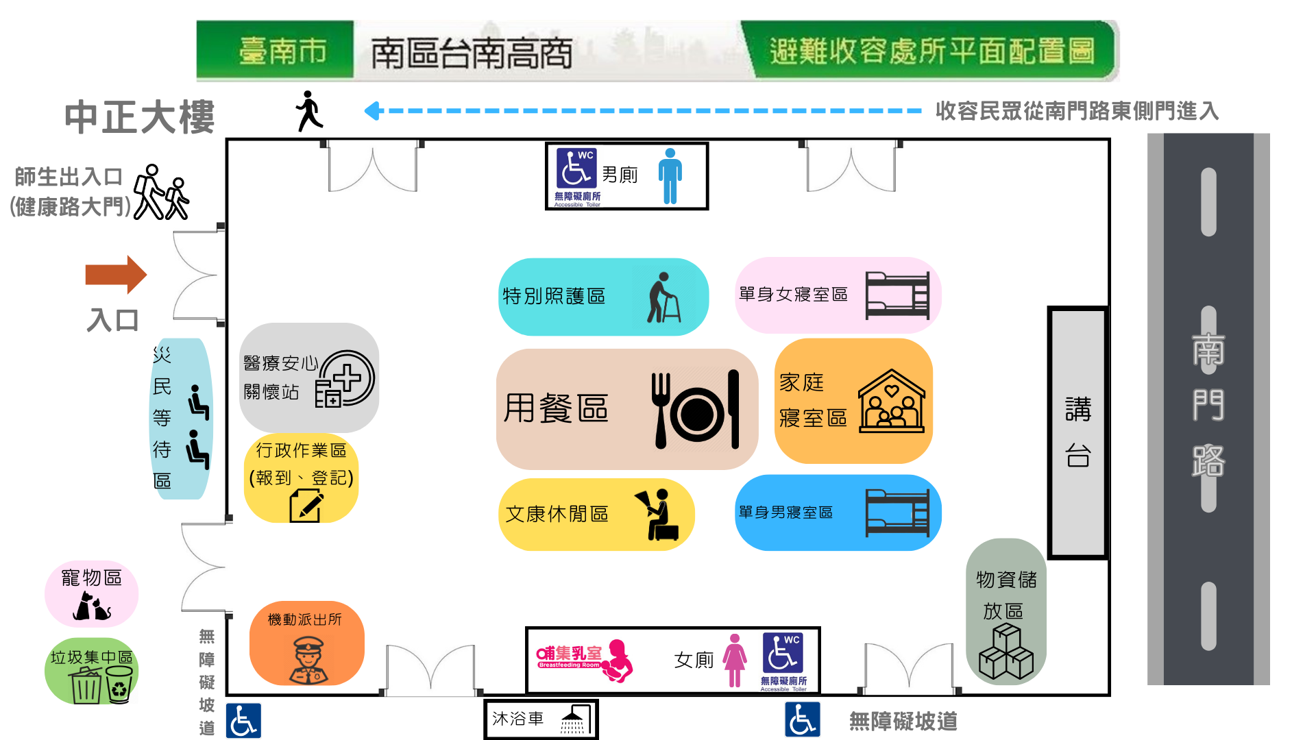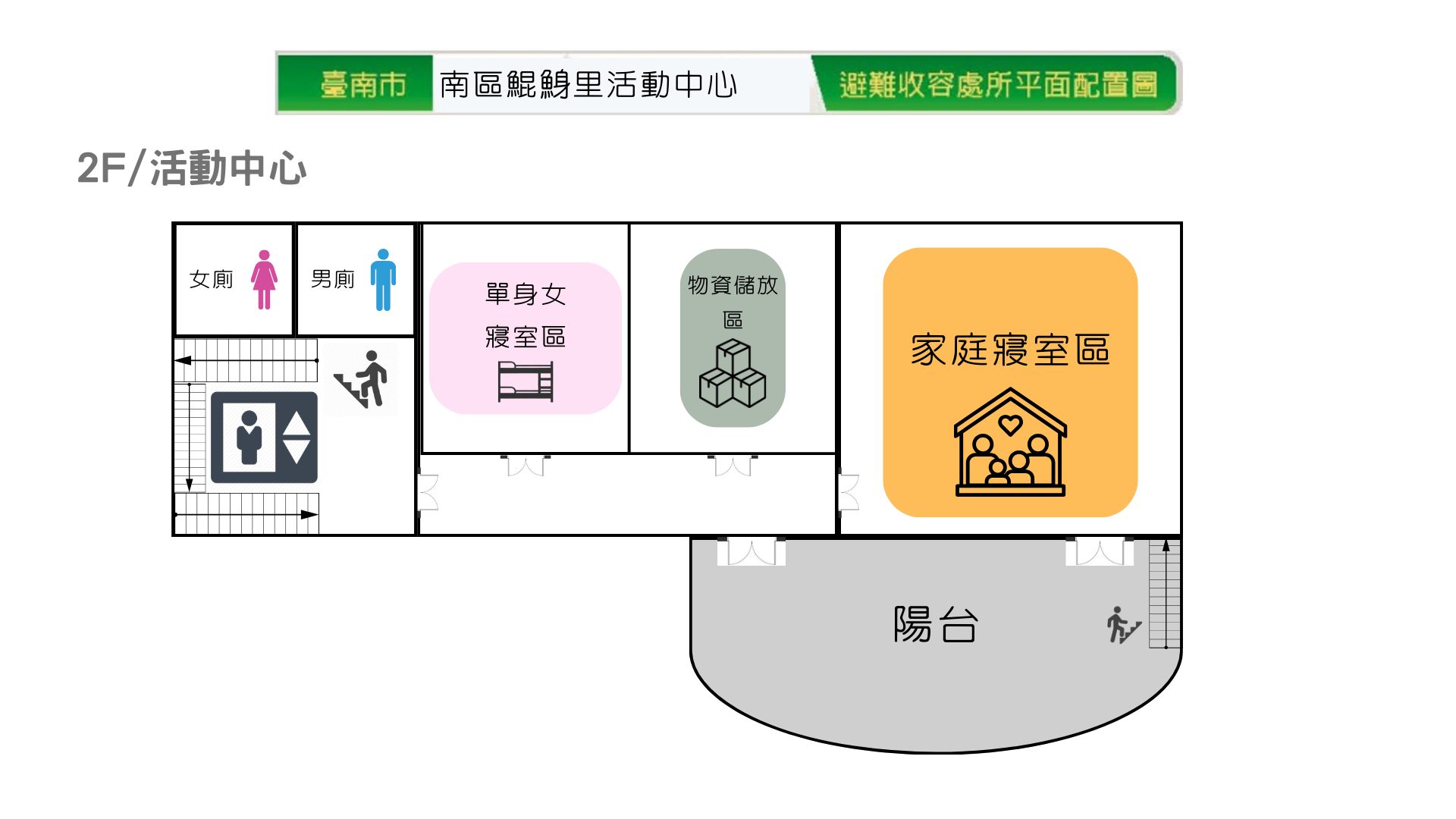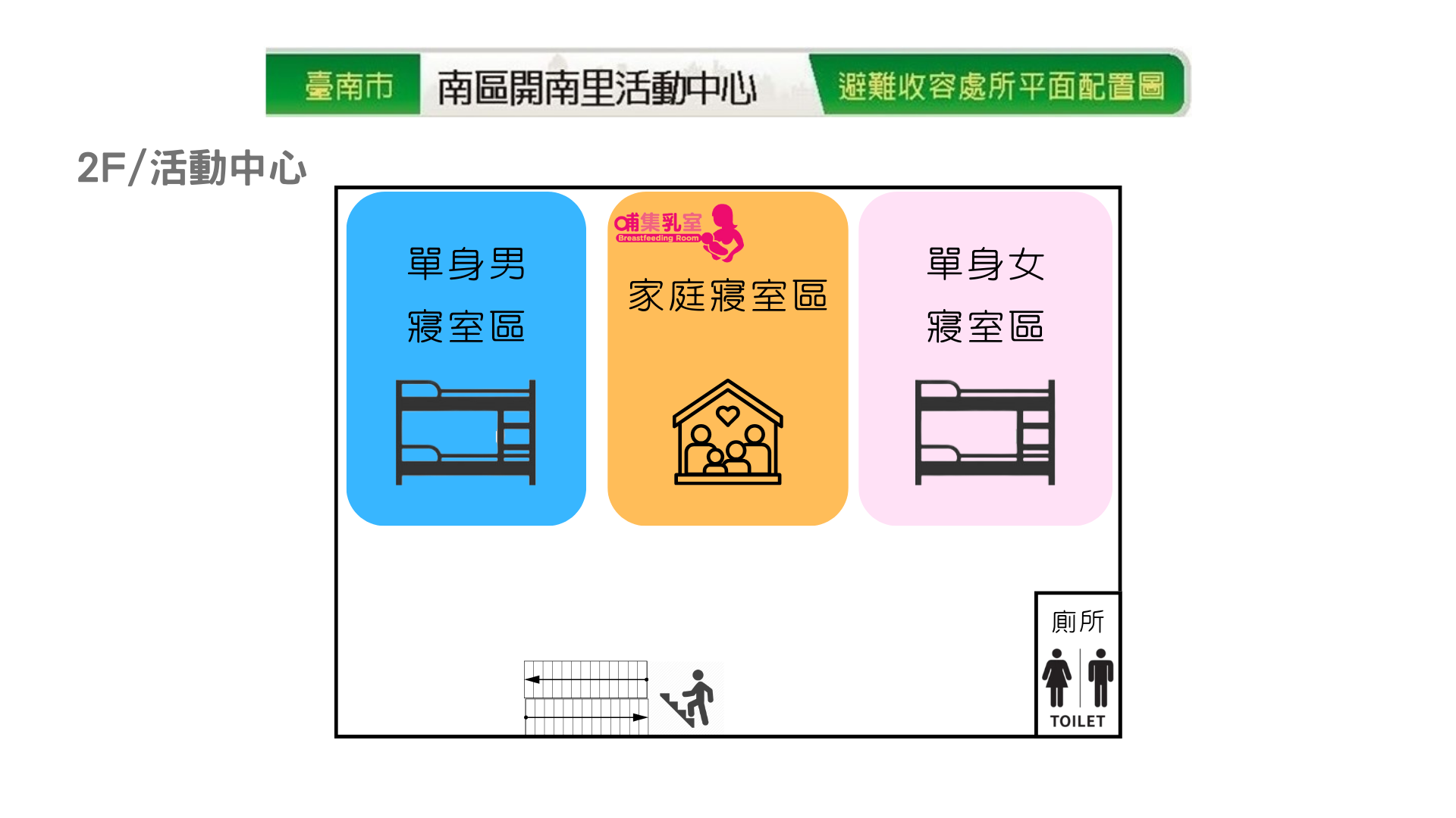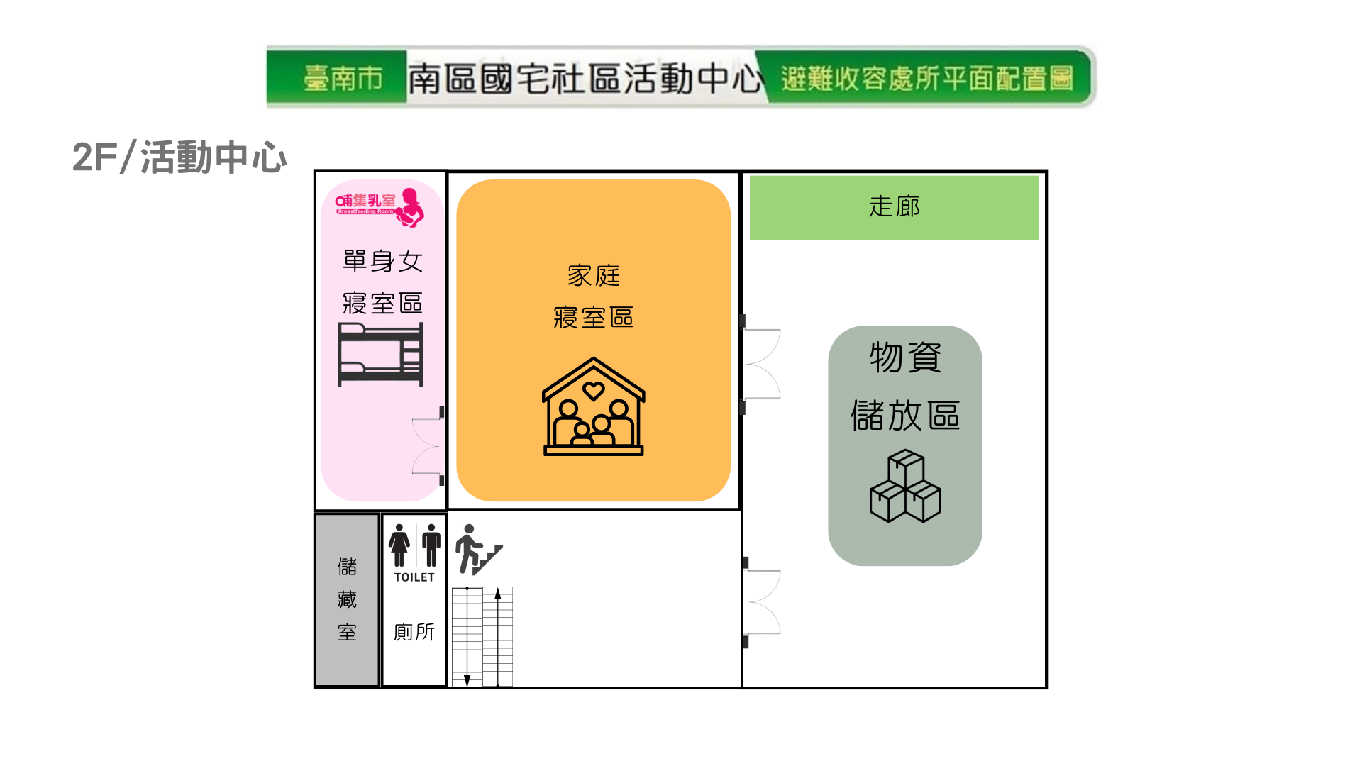 本區目前規劃12處避難收容處所南區區公所平面配置圖(3樓大禮堂)新興國中所平面配置圖(新興館)(操場)大成國中所平面配置圖(樂群館)(操場)臺南高商平面配置圖(中正大樓)(操場)龍崗國小平面配置圖(操場)永華國小平面配置圖(體育館1樓)(2樓)(操場)南寧高中平面配置圖灣裡聯合里活動中心平面配置圖(1樓與2樓)(3樓與4樓)明興社區活動中心1樓與2樓平面配置圖(1樓與2樓)(3樓)國宅社區活動中心平面配置圖(1樓)(2樓)(3樓)開南里活動中心平面配置圖(1樓)(2樓)鯤鯓里活動中心(1樓)(2樓)