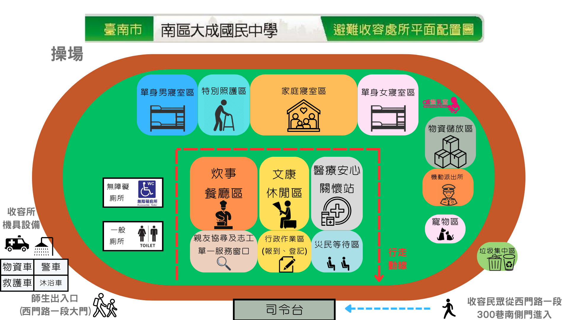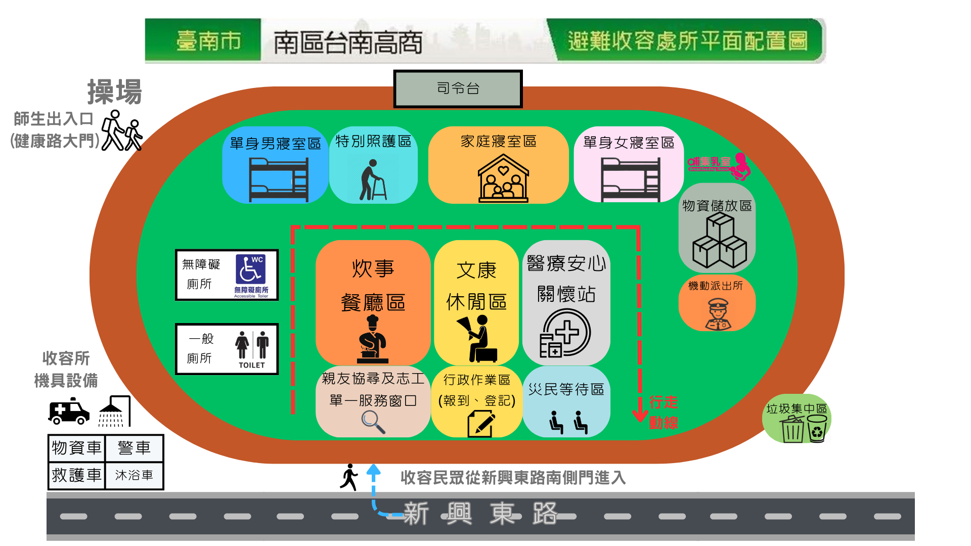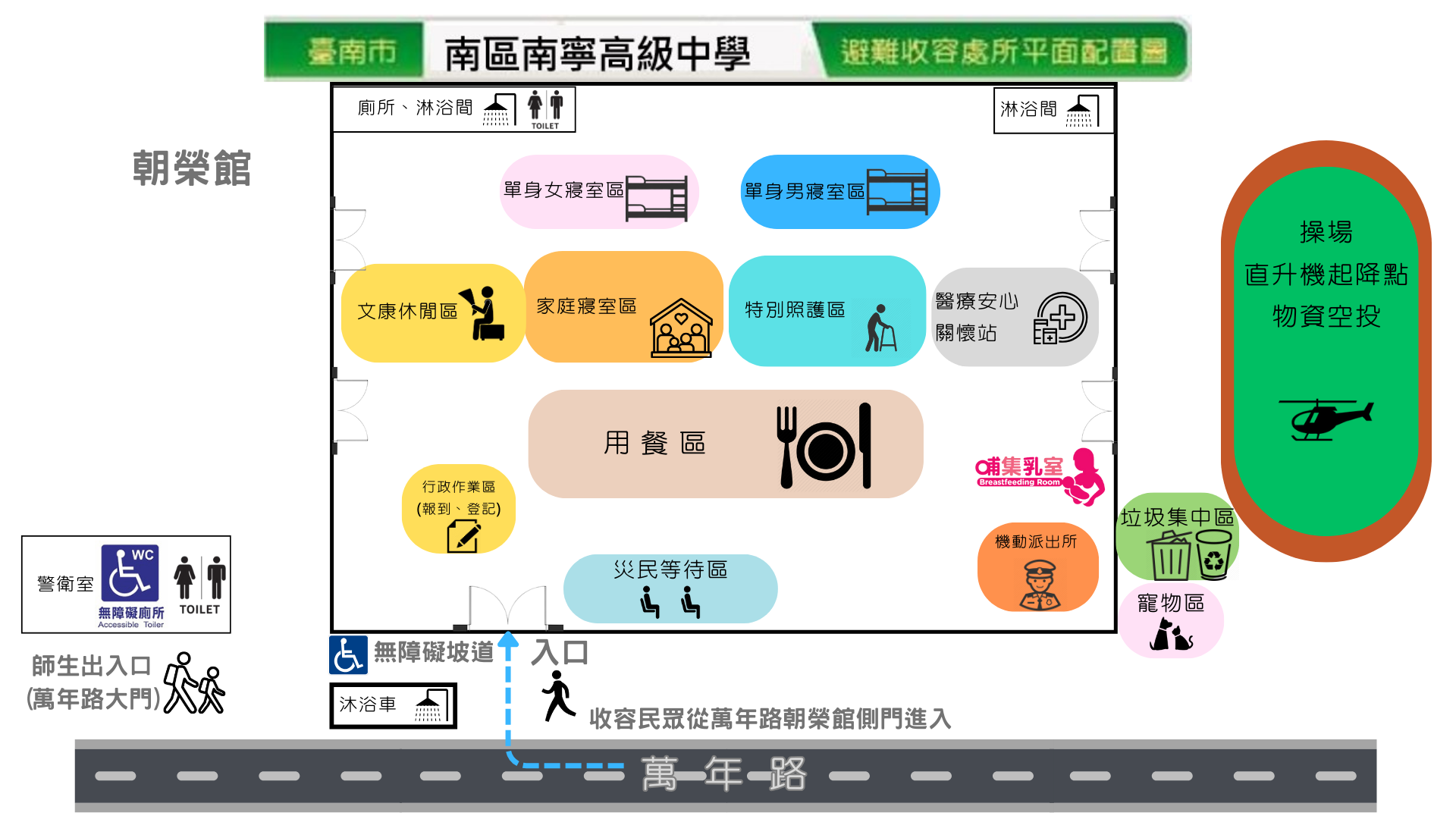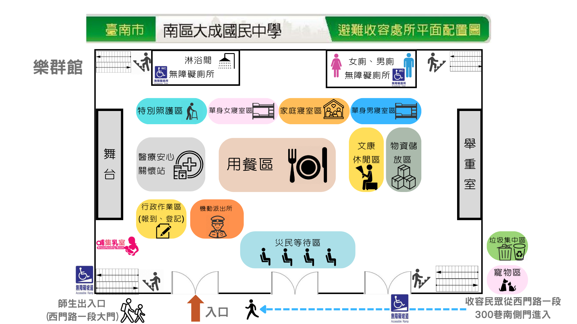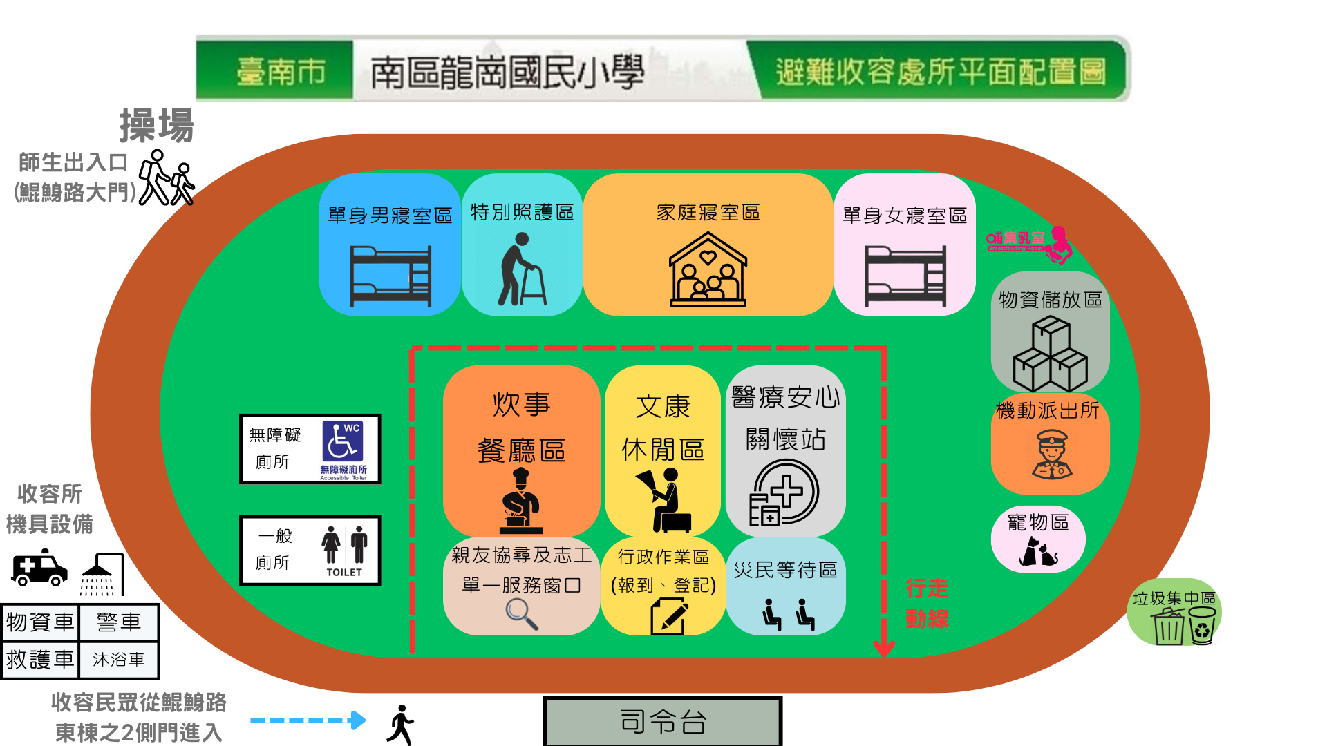 本區目前規劃12處避難收容處所南區區公所平面配置圖(3樓大禮堂)新興國中所平面配置圖(新興館)(操場)大成國中所平面配置圖(樂群館)(操場)臺南高商平面配置圖(中正大樓)(操場)龍崗國小平面配置圖(操場)永華國小平面配置圖(體育館1樓)(2樓)(操場)南寧高中平面配置圖灣裡聯合里活動中心平面配置圖(1樓與2樓)(3樓與4樓)明興社區活動中心1樓與2樓平面配置圖(1樓與2樓)(3樓)國宅社區活動中心平面配置圖(1樓)(2樓)(3樓)開南里活動中心平面配置圖(1樓)(2樓)鯤鯓里活動中心(1樓)(2樓)