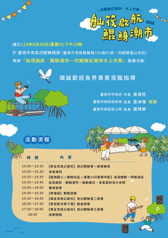 臺南市南區區公所為了推廣在地觀光產業,活化社區經濟,將於9月20日(六)盛大舉辦「2025年四鯤鯓紅樹林水上市集」。今(114)年度以「舢筏啟航・鯤鯓潮市」的活動,將結合四鯤鯓豐富的海洋文化與紅樹林生態資源,打造全臺唯一的海陸市集體驗,邀請大小朋友共襄盛舉。