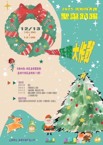 喜樹圖書館說明,今年聖誕趴踢內容豐富多元,除了每年的志工表揚,還有由「藝想天開魔法故事悅讀協會」帶來小朋友最期待的兒童故事劇「聖誕任務大作戰」,團員們將帶領觀眾共同經歷一場關於「笑聲、勇氣與愛」的聖誕冒險,四位神祕角色將如何聯手展開任務?劇情充滿未知與驚喜,邀請大小朋友一起到現場揭曉故事的結局。故事劇後,更安排歡樂的交換禮物時間,想參加的民眾可自行準備價值60至120元的小禮物,共同分享喜悅、傳遞溫暖。此外,更加碼推出「聖誕快閃活動」,只要當天在喜樹圖書館借閱8本書,不僅可參加「樂讀拚識界」集章活動,還能獲得一顆好吃的彩色蛋(每人限領一次,數量有限,送完為止),讓民眾在幸福歡樂的節慶氛圍中,持續享受閱讀的樂趣。