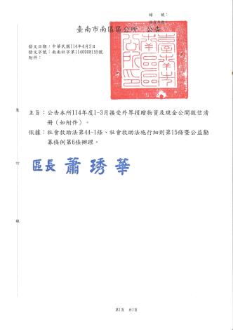 #公告臺南市南區區公所114年度1-3月接受外界捐贈物資及現金公開徵信清冊